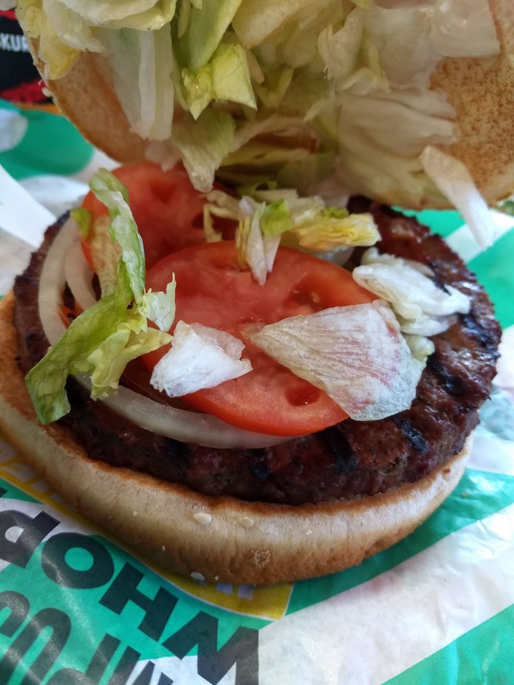A flame-grilled, plant-based patty with juicy tomatoes, crisp lettuce, creamy mayonnaise, ketchup, crunchy pickles, and sliced white onions on a toasted sesame seed bun. *Patty cooked on the same broiler as beef patties.