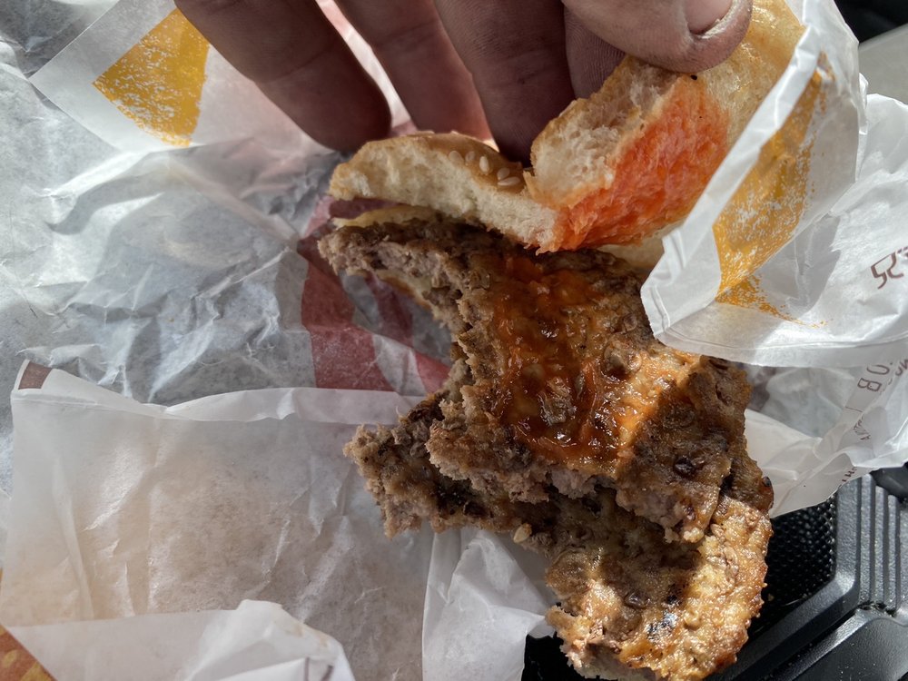 Two flame-grilled patties–for a 1/4 lb* of beef–with crispy bacon, melted American cheese, crunchy pickles, yellow mustard, and ketchup on a toasted sesame seed bun. *Weight based on pre-cooked patty.